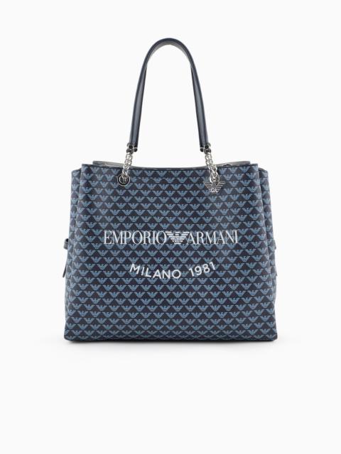 Shopper bag featuring two handles, a practical adjustable, detachable shoulder strap, our signature shaped eagle charm and a silk-screen logo patch. Convenient matching removable inner pouch that can be fastened or detached from the bag according to your liking. Both casual and practical, this women’s bag is suitable for daily use while retaining its distinctive style thanks to the monogram with the iconic all-over eagle. Product Code: Y3D158YWS0E186284 Details Composition 100% Polyester 0% PVC - Polyvinyl chloride Measurements: 31 x 24 x 18.5 cm PVC coating All-over logo Detachable shoulder strap Two handles Logo print Magnetic closure Eagle charm Unlined Matching internal pouch with zip
