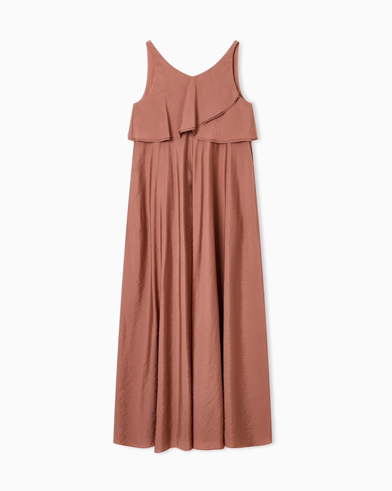 Sleeveless dress with double ruffles on the neckline, made of technical modal muslin and equipped with side pockets. The neckline on the back enhances the femininity of the model. The garment belongs to the Icon capsule. Length: 145 cm Technical muslin Neckline with ruffles Long skirt with pleats Side pockets Neckline on the back Invisible zip closure on the back Product Code: EW003726TE18966U2009