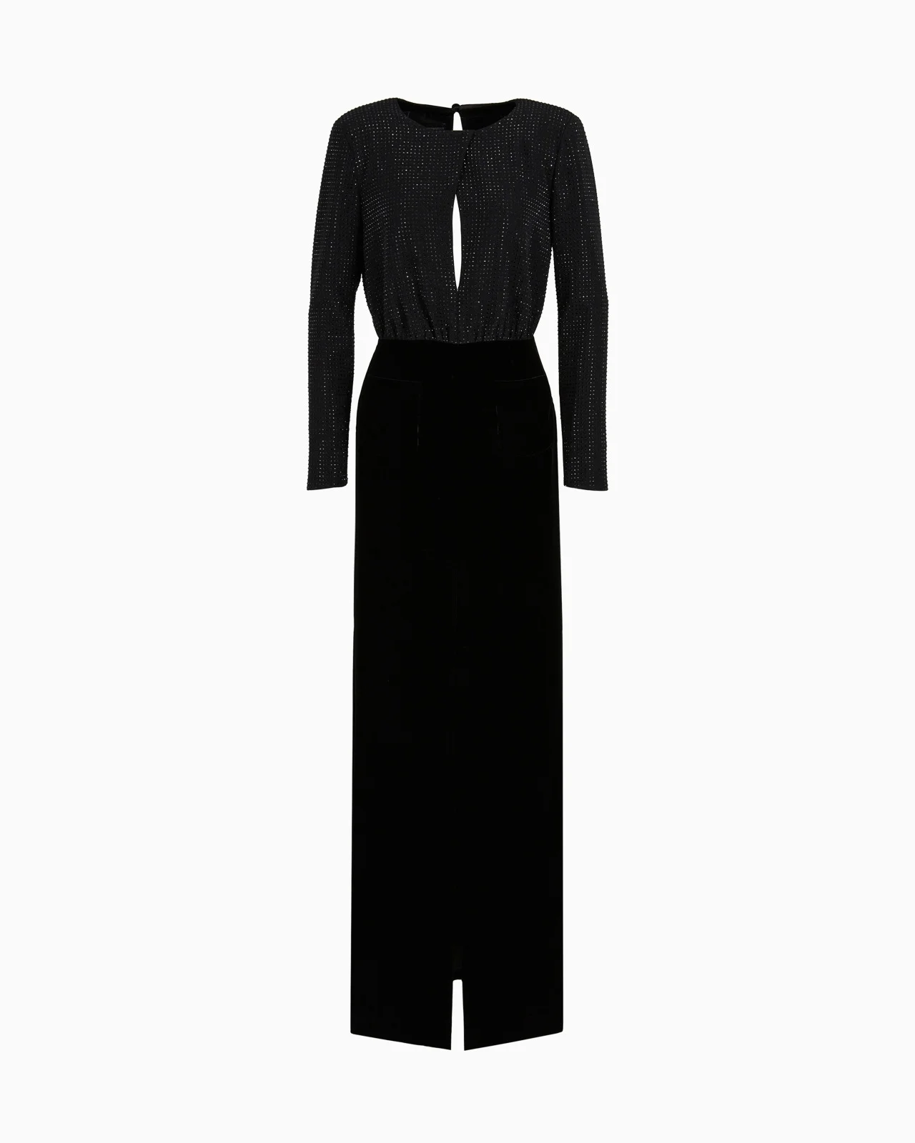 Long, round-neck dress with a slash opening on the front and back. Made from a fluid cady on the upper section encrusted with matching-tone, faceted pyramidal rhinestones, while the black, floor-length skirt is made from a soft and dense cupro-blend velvet and features a deep front slit. A style that affirms elegance and glittering sophistication, to be worn on the most exclusive and special occasions. Product Code: EW000060AF102081UC001 Details Composition 65% Viscose 35% Cupro Length: 153 cm Rhinestone-encrusted cady upper section Rounded neckline Front slash opening Long sleeves Zipped cuffs Velvet skirt Front slit Back slash closure with button Velvet-covered button Back zip on the skirt Georgette lining Fitting The model is 178 cm tall and is wearing size 40/S (Italian Size)