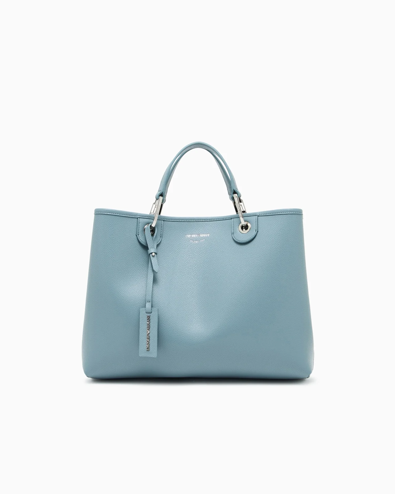 Deer-print medium shopper bag with magnetic clasp and silk-screen logo. The item is embellished with removable logo snap clips and tags with embossed logo lettering that match the bag. Featuring a matching inner zip pouch and detachable logo shoulder strap. This item belongs to the MyEA line, the selection of iconic and exclusive Emporio Armani bags that are most representative of the label. Choose the piece and complete it with accessories from the line that suits your style. Measurements: 37.5 x 27 x 11.5 cm Deer-print finish Solid coloured Silkscreen logo Two handles Logo clips Detachable logo shoulder strap Matching internal pouch with zip Product Code: EW000360AF12036M9110