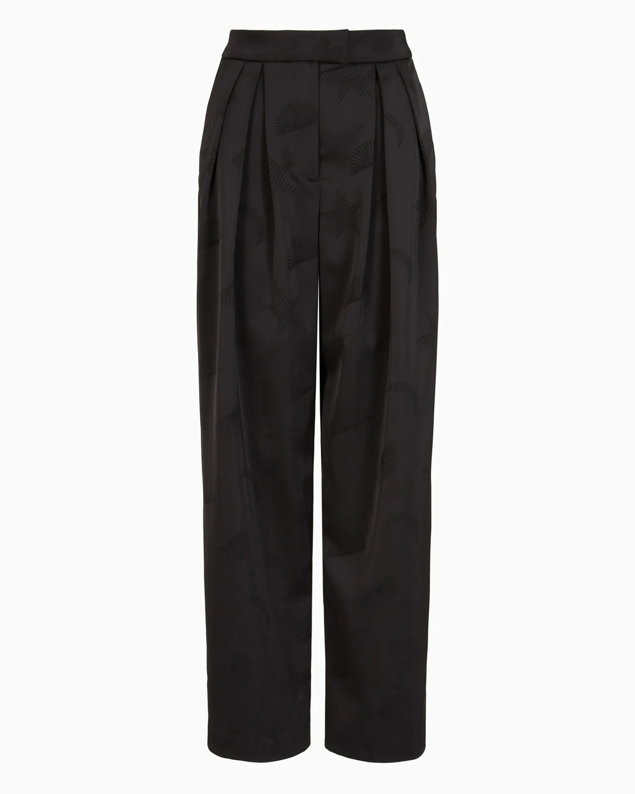 Trousers with front godet pleats with a peplum that can be removed using the zip at the waist. The jacquard fabric shows off the tone-on-tone collection pattern. The item belongs to the exclusive Moon Capsule collection in which rhinestones and sparkling details recreate lunar and star elements on deep, dark backgrounds, embellishing the pieces in the selection with touches of brilliance. Elongated silhouettes glide through the moonlight in mysterious, nocturnal settings. Milky accents, similar to a starry sky, light up dark velvets, while the sparkle of sequins makes dresses shine and elevates tops, giving them a feminine, elegant and dreamy allure. Product Code: EW000334AF119061FC036 Details Composition 100% Polyester Jacquard fabric Collection pattern Removable peplum Concealed zip-and-hook closure Godet pleats Unlined garment Fitting The model is 178 cm tall and is wearing size 40/S (Italian Size)
