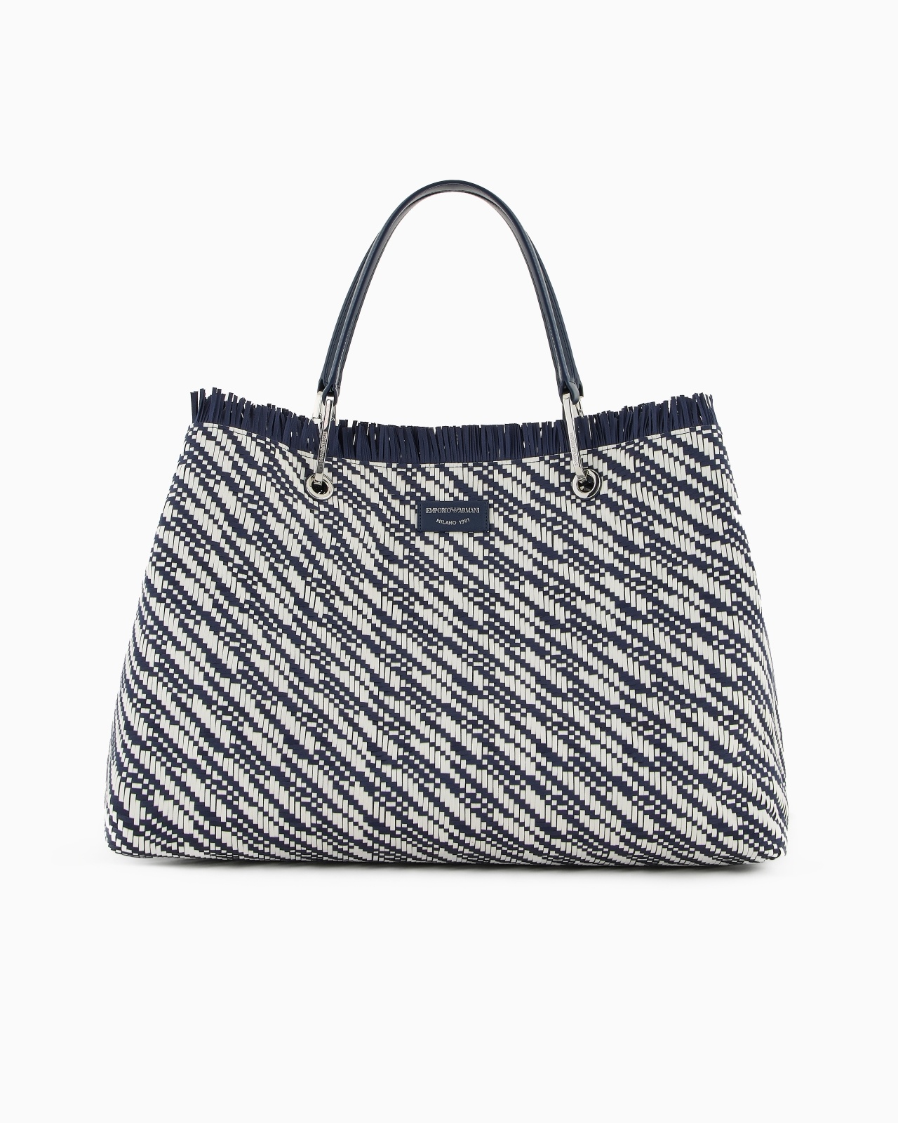 Large basketweave shopper bag with magnet closure. The item is embellished with decorative fringing, logo clips and an internal zipped pouch. This item belongs to the MyEA line, the selection of iconic and exclusive Emporio Armani bags that are most representative of the label. Choose the piece and complete it with accessories from the line that suits your style. Measurements: 48 x 32 x 18 cm Basketweave Logo patch Two handles Logo clips Internal zipped pouch Product Code: EW001001AF12759FB251