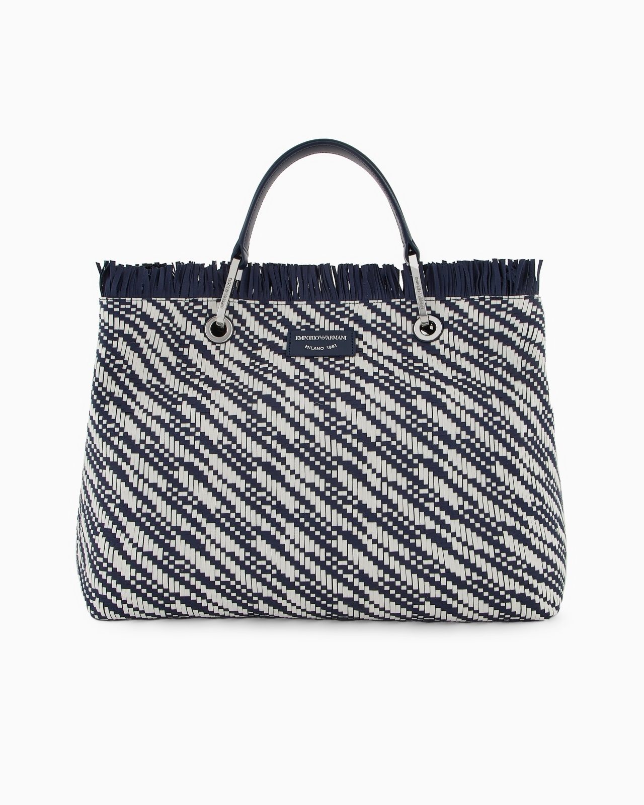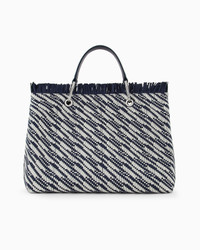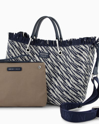 Medium basketweave shopper bag. Item embellished with decorative fringes, logo clips and detachable webbing shoulder strap. This item belongs to the MyEA line, the selection of iconic and exclusive Emporio Armani bags that are most representative of the label. Choose the piece and complete it with accessories from the line that suits your style. Measurements: 37.5 x 27 x 11.5 cm Basketweave Two handles Logo clips Logo patch Removable webbing shoulder strap Lined Product Code: EW000360AF12759FB251