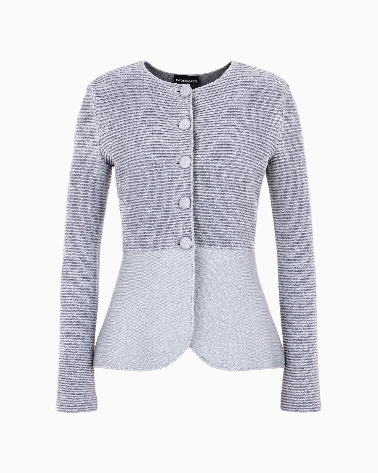 Crew-neck jacket with front buttoning and knit fabric peplum at the hem. This jacket proves itself, thanks to its versatility, as a key wardrobe piece that can be worn both as outerwear or as a cardigan for everyday wear. The ottoman fabric creates refined raised ribs all over, making it unique and adaptable for multiple outfits. Product Code: 6D2GT12M21Z10642 Details Composition 46% Polyamide 45% Viscose 7% Polyester 2% Elastane Ottoman fabric Crew neck Front buttoning Covered buttons Knit fabric peplum Fitting The model is 178 cm tall and is wearing size 40/S (Italian Size)