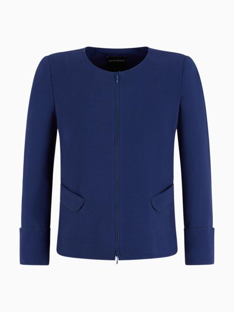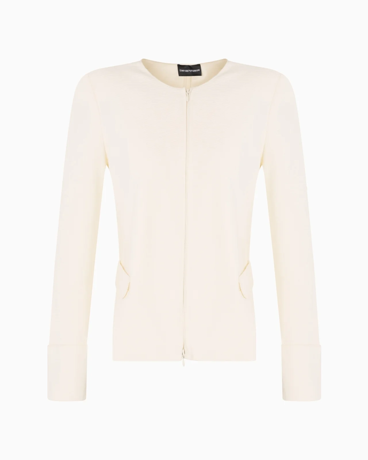 Jacket with front zip fastening, shoulder pads and side pockets with flaps. The piece is made of ottoman, a fabric creates refined raised ribs all over, making it unique and adaptable for multiple outfits. Ottoman jersey Full zip Crew neck Side welt pockets with flap Long sleeves Finished cuffs Unlined garment Product Code: EW001517AF12364U0006