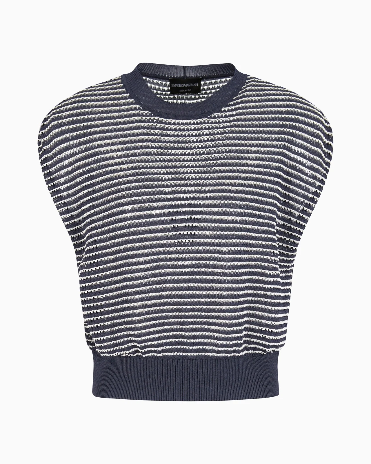 Round-neck jumper with short cap sleeves and stretch hem, made from a perforated viscose blend. The fabric features a unique striped, perforated weave that bestows refinement and texture to the style. Perforated viscose blend Rounded neckline Short cap sleeves Finished edges Product Code: EW001665AF15884FB012