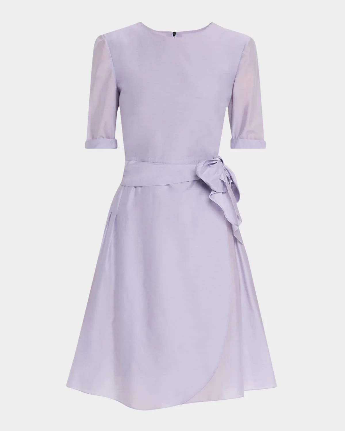 - Emporio Armani muslin mini dress with side bow and pleated skirt - Crew neckline - Short sleeves - On-seam pockets - Hem falls above the knee - A-line silhouette - Back zipper - Lyocell/nylon/polyamide - Lining: Cotton - Dry clean - Made in Romania