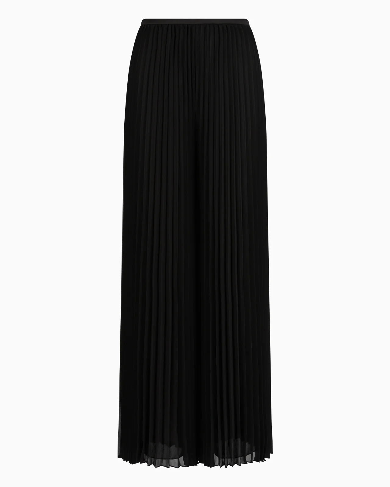 These particularly wide-leg trousers with a design that makes them similar to culottes, are made from technical georgette. Thanks to the natural lightness of the fabric, the piece acquires femininity and airiness, while the fabric’s natural sheerness enhances the refined sensuality of the style. Technical georgette Pleated Satin piped waist Concealed zip fastening at the back Lined garment Product Code: EW000840AF10209UC001
