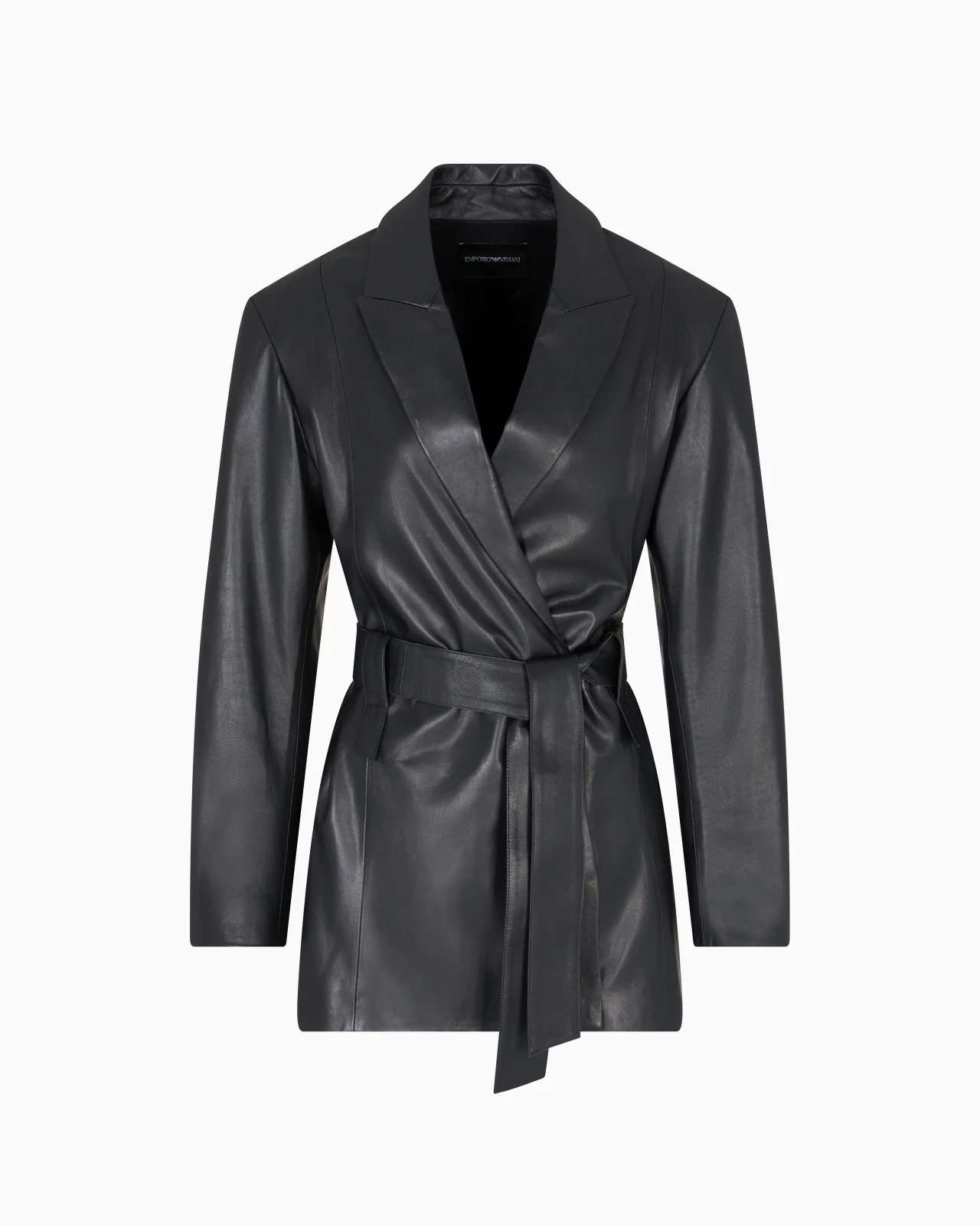 Jacket with lapel collar made of vegetable-tanned lambskin nappa leather using tannin extracted from olive leaves, a vegetable tanning process that gives the leather a rugged look and natural sheen. The relaxed-fit style has an internal press-stud closure and a removable belt that accentuates the waist and enhances the silhouette. The item is part of this season’s new Polygon capsule collection, where vertical lines and geometric cut-outs capture the essence of a modern, elegant design. An offering that exudes post-modernist vibes, creating a perfect balance between functionality and aesthetic harmony: structured and refined creations are developed in melange grey tones that go hand in hand with the warmest undertones of burgundy. Vegetable-tanned nappa leather Lapel collar Press-stud closure Long sleeves Detachable matching belt Side pockets Serge lining Product Code: EW002798AF19290UC001
