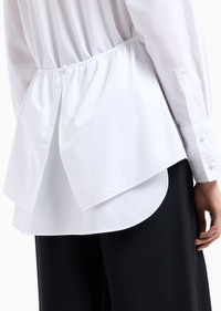 Shirt with classic collar, asymmetric hem and original stretch peplum that can be opened via a button at the back. Made from crisp pure cotton poplin, it adds a summery touch to every look, while the comfortable fit confirms its modern attitude. Product Code: 6D2C692N0FZ10100 Details Composition 100% Cotton Poplin Classic collar Closure with covered buttons in matching fabric Long sleeves Cuffs with button and darts Asymmetric hem Stretch peplum with button at the back Fitting The model is 178 cm tall and is wearing size 40/S (Italian Size)