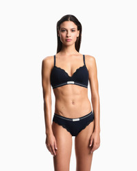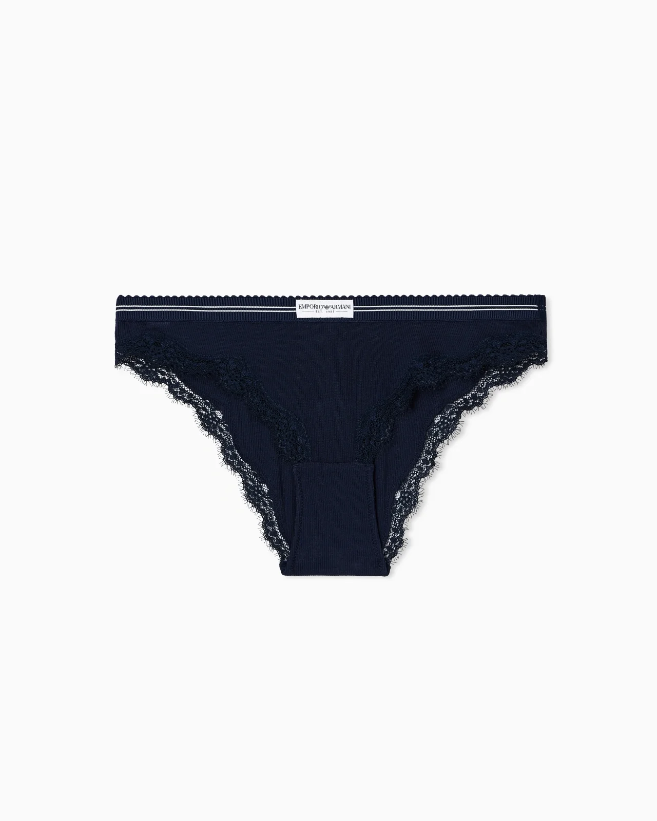 Briefs made of ribbed fabric with an elasticated waist and contrasting front logo. The style is embellished with lace trims that complete the garment. Rib knit Elasticated logo waist Lace trim Product Code: EW000378AF15360UB101