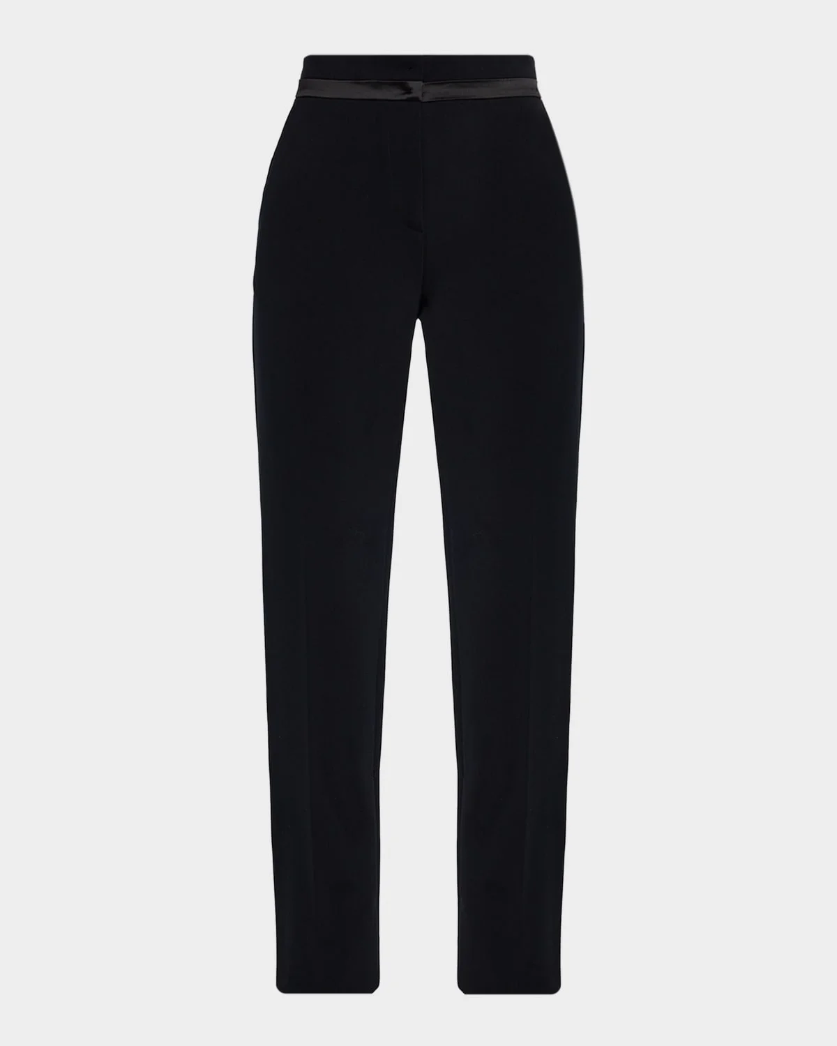 Emporio Armani elegant trousers topped with a tonal satin band High waist Flat front Pressed creases Ankle length Straight legs Hookandbar; zip fly Polyester/elastane Dry clean Imported