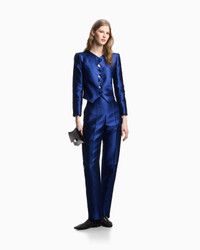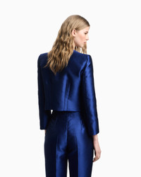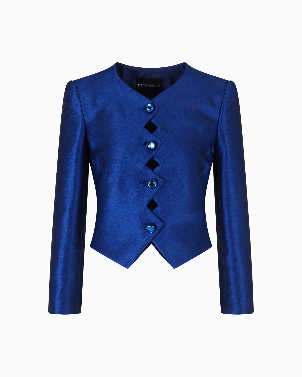 Scoop-neck jacket made from shantung-effect fabric that adds a luxurious touch and adds identity to the style. The short, fitted piece features a distinctive zig-zag fastening with domed buttons with a shiny finish. Vibrant touches of blue and fuchsia create modern, elegant looks. Front zig-zag detail Domed button closure Hanging sleeves Taffeta-lined garment Product Code: EW001690TE14303UB087