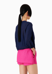Shirt jacket with concealed press-stud closure, made of an exclusive seersucker fabric, one of Armani’s favourite textures. A micro waffle-effect gingham-look weave gives the whole garment a particular 3D effect, illuminated by lurex filaments in the weave. A garment with a double fit that can be worn as either a shirt or a jacket, giving the comfort of a crisp shirt, the structure needed for outerwear use or creating multi-layered outfits. Product Code: 3D2B732NX4Z10932 Details Composition 42% Polyamide 32% Cotton 26% Viscose Seersucker Satin-trimmed round neck with domed button Three-quarter sleeves Stretch armholes Concealed satin-trimmed press-stud closure Drawstring hem Fitting The model is 178 cm tall and is wearing size 40/S (Italian Size)