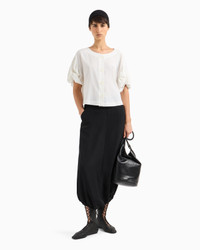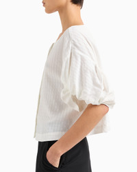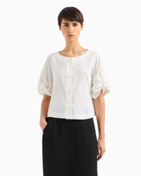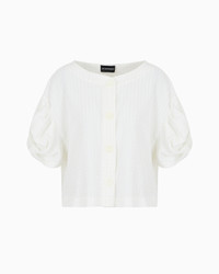 Shirt jacket made of viscose with an all-over gingham check motif that creates a distinctive all-over 3D effect. The piece, with front buttoning, features wide three-quarter length sleeves with a twisted balloon effect that enhance the femininity of the piece. Check motif Rounded neckline Button closure Twisted sleeves Unlined garment Product Code: EW000709AF12689U0006