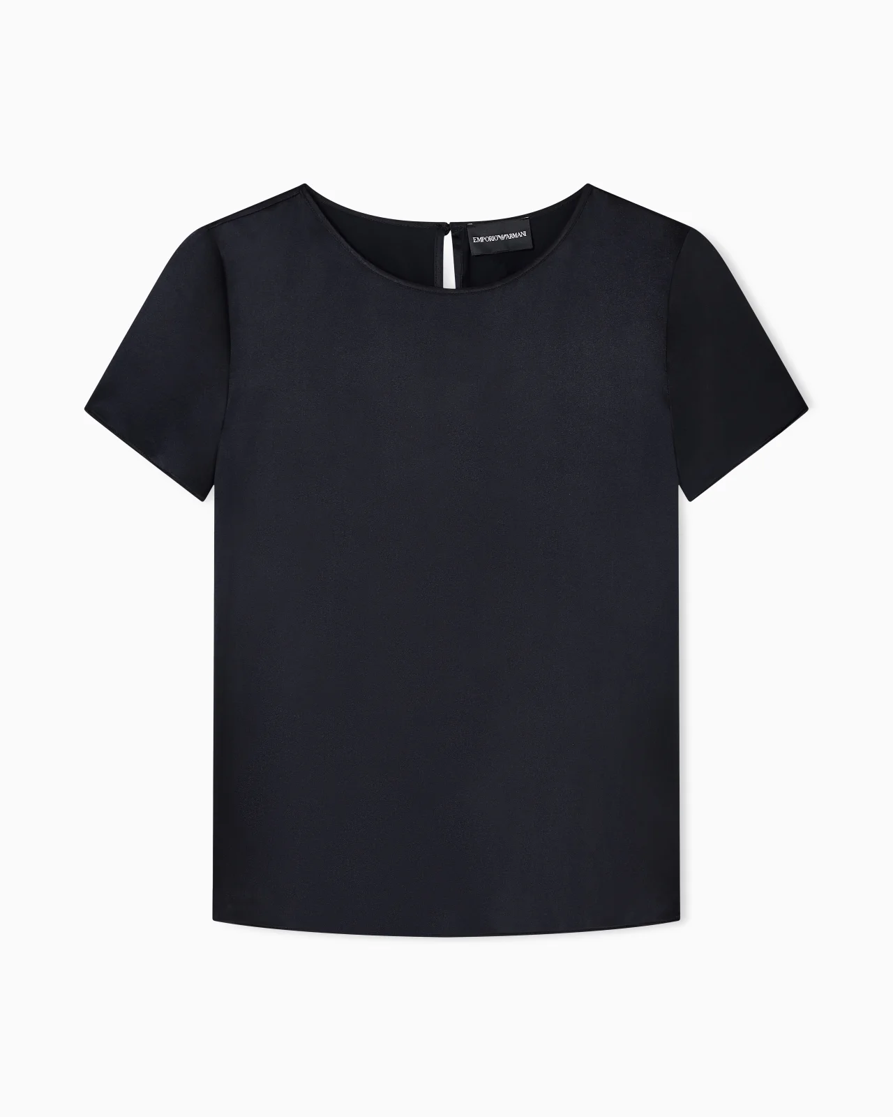 Women’s short-sleeved blouse made of exquisite silk satin with a natural sheen that adds charm to even the most basic outfits. Rounded neckline with arched back button closure. The piece belongs to the Essentials selection, the Emporio Armani capsule collection that makes a statement of enduring style: both elegant and practical, it works for numerous combinations on a wide array of occasions. The colour palette includes the brand’s characteristic neutral shades, combined with a minimalist design to create a series of key pieces for the female wardrobe. Product Code: 8N2K152NXXZ10999 Details Composition 94% Silk 6% Elastane Silk satin Rounded neckline Short sleeves Back pointed closure with button Fitting The model is 178 cm tall and is wearing size 40/S (Italian Size)