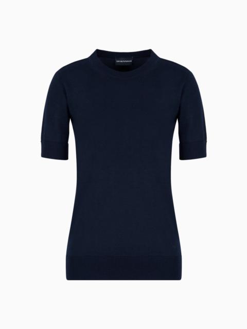 This pure virgin wool, short-sleeved jumper can be worn anywhere in a wide array of outfits. Soft, plain-knit weave with ribbed trim. The piece belongs to the Essentials selection, the Emporio Armani capsule collection that makes a statement of enduring style: both elegant and practical, it works for numerous combinations on a wide array of occasions. The colour palette includes the brand’s characteristic neutral shades, combined with a minimalist design to create a series of key pieces for the female wardrobe. Product Code: 8N2MZS2M9DZ10616 Details Composition 100% Virgin Wool Fineness: 14 Plain knit Crew neck Short sleeves Ribbed trim Colour-matched micro eagle embroidered on the left hem Fitting The model is 178 cm tall and is wearing size 40/S (Italian Size)