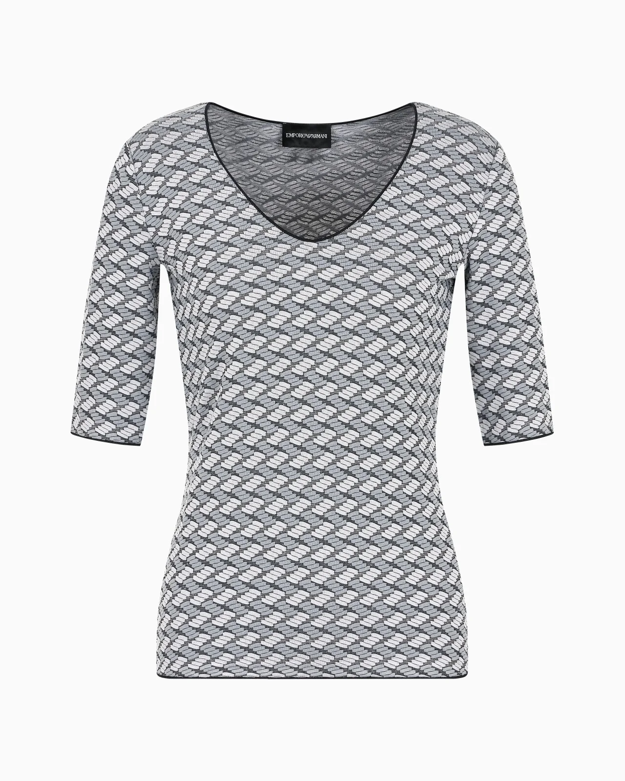Short-sleeved V-neck jumper in embossed jacquard jersey