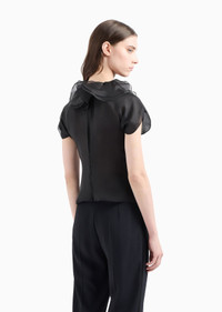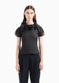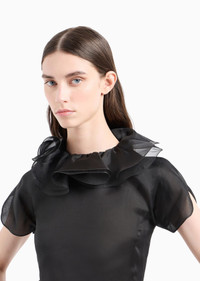 Short-sleeved blouse with exclusive petal collar with ruffles, made of exquisite, lightweight, sheer pure silk organza. The item belongs to the exclusive Moon Capsule collection in which rhinestones and sparkling details recreate lunar and star elements on deep, dark backgrounds, embellishing the pieces in the selection with touches of brilliance. Elongated silhouettes glide through the moonlight in mysterious, nocturnal settings. Milky accents, similar to a starry sky, light up dark velvets, while the sparkle of sequins makes dresses shine and elevates tops, giving them a feminine, elegant and dreamy allure. Product Code: EW000310TE112921UC001 Details Composition 100% Mulberry silk Silk organza Petal collar with ruffles Short sleeves Back zip closure Georgette lining Fitting The model is 178 cm tall and is wearing size 40/S (Italian Size)