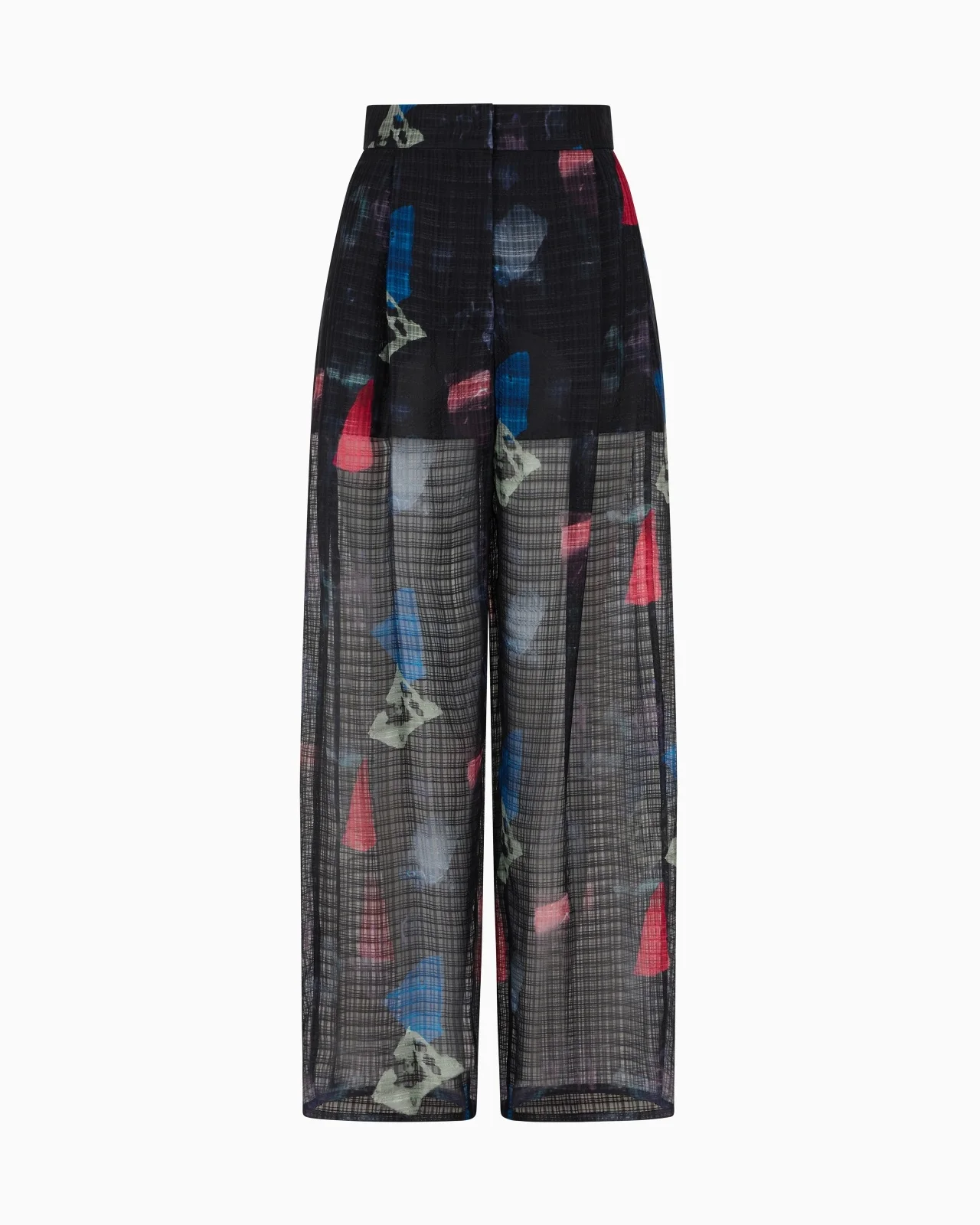 Trousers with pleats and elasticated back waist, made from a silk blend that adds a touch of sophistication to any outfit thanks to its natural transparency and fluidity. The micro check motif becomes the perfect backdrop for the abstract print that distinguishes the piece. Micro-check motif Abstract print Waist pleats Zip, press-stud and internal button closure Side georgette pockets Elasticated waist at the back Lined garment Product Code: EW001687TE13522PC007
