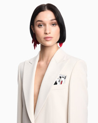 Single-breasted blazer with a peak lapel collar made of envers satin, a fluid fabric that glides softly over the silhouette. The style is distinguished by the removable playing-cards detail in the pocket-square pocket and the jacquard lining in the collection pattern. The intriguing world of playing cards is the theme running through this season’s women’s collection. The Jeu de Cartes theme is playfully interpreted in different details of the collection: the elegance and refinement of Emporio Armani intertwine with the classic symbols of the playing-card suits, together with intense and vibrant colours that combined with softer shades create looks with a mysterious and sophisticated allure. Envers satin Single-breasted Peak lapels Press-stud closure Long sleeves Pocket-square pocket Playing cards detail removable by press studs Double-welt side pockets Back vents Collection motif jacquard lining Product Code: EW002636TE10419U1144