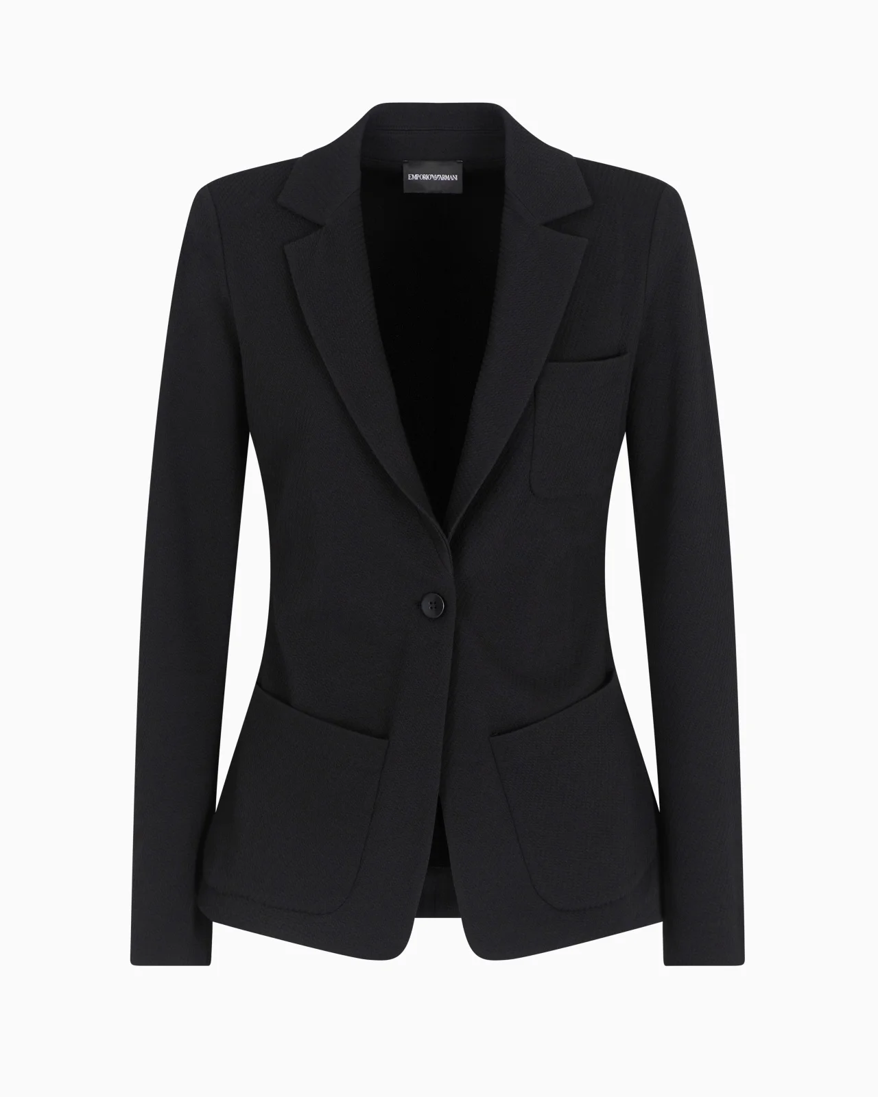 Single-breasted jacket with notched lapels at the neckline. Made from a cotton-blend jersey and featuring a jacquard-knit that creates an exclusive all-over knit effect. Stretch jersey Jacquard Knit-effect weave Single-breasted Lapel collar Button closure Long sleeves Patch pocket for a pocket square Side patch pockets Slit at the back Matte satin interior details Product Code: EW000688AF12421UC001