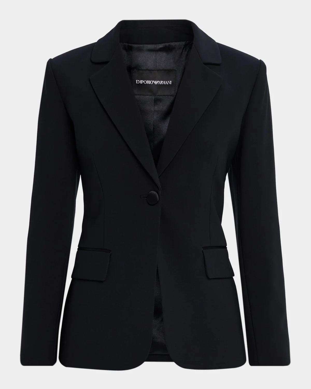 Finished with contrast satin trim on the pockets and sleeves, this Emporio Armani blazer boasts classic sartorial details Notched lapels Long sleeves Two hip flap pockets Vented back Cutaway hem Tailored fit Singlebutton closure Polyester/elastane Dry clean Imported