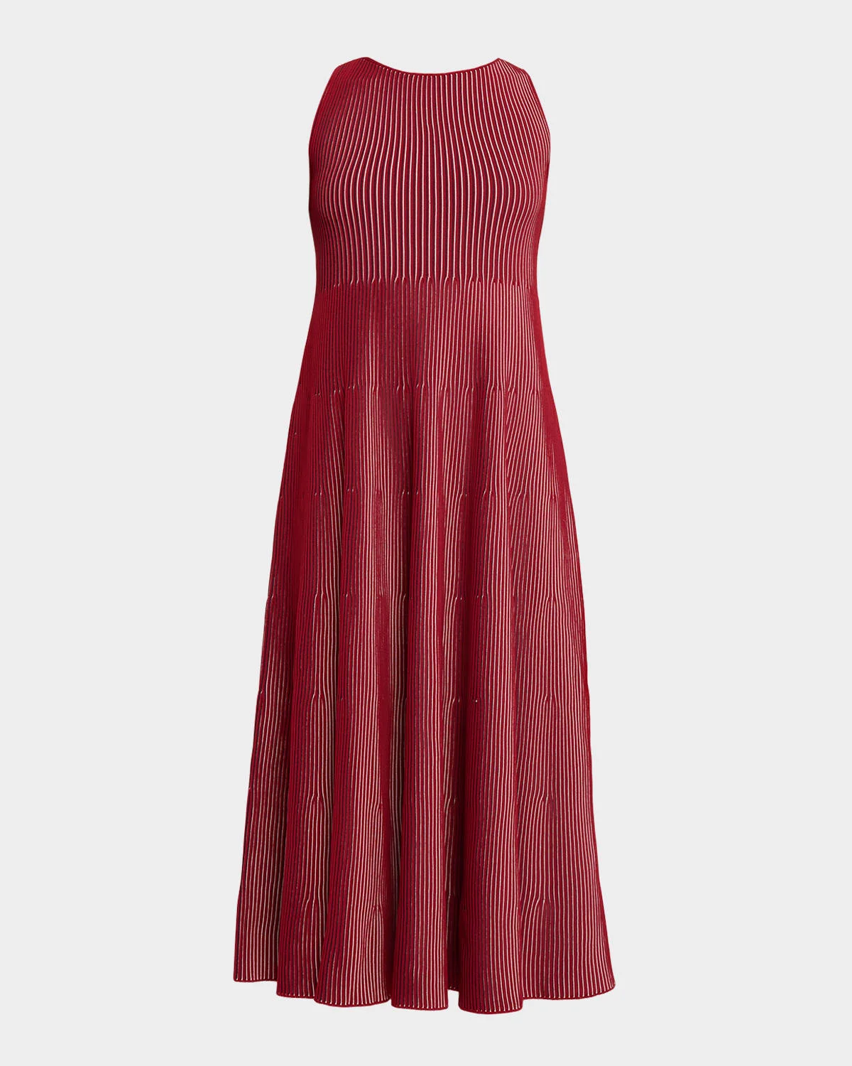 - Emporio Armani ribbed knit maxi dress with vertical stripes - Crew neckline - Sleeveless - Hem falls below the knee - A-line silhouette - Slipover style - Polyester/viscose - Dry clean - Imported