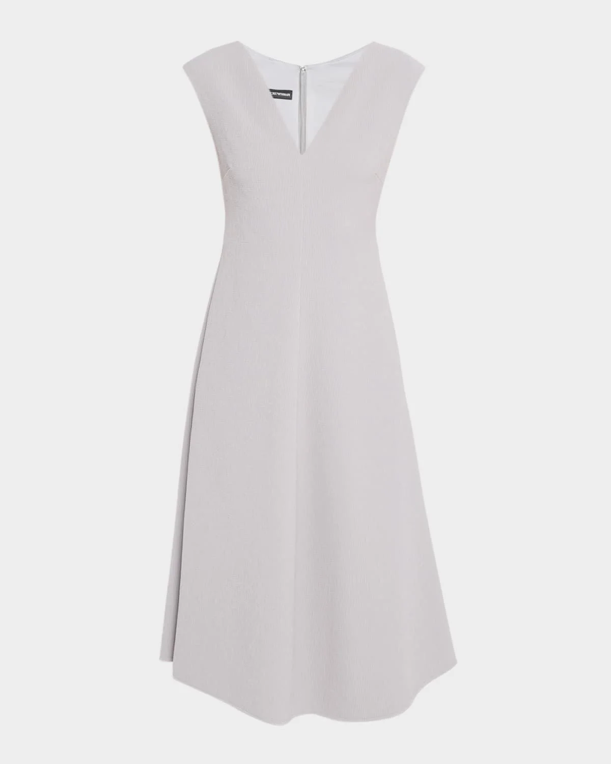 This Emporio Armani midi dress is cut from richly textured fabric with a front seam and back princess seams for clean tailoring V neckline Sleeveless Hem falls below the knee Aline silhouette Invisible back zipper Polyester/elastane Dry clean Imported