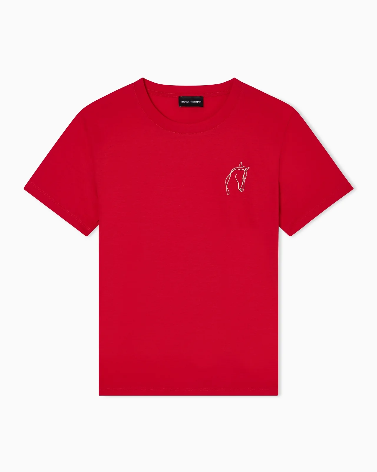 Slim fit crew-neck T-shirt, made of pure cotton jersey. The model is characterized by the silhouette with collection rhinestones on the chest. The garment belongs to this season's Lunar New Year capsule, whose protagonist is the horse, symbol of energy, passion and desire for freedom: tradition and superstition blend with the roots of the Far East, giving life to auspicious influences and symbols, characterized by recognizable details and graphics. Slim fit Jersey Crew neck Short sleeves Collectible item with rhinestones Product Code: EW003970AF10003U5061