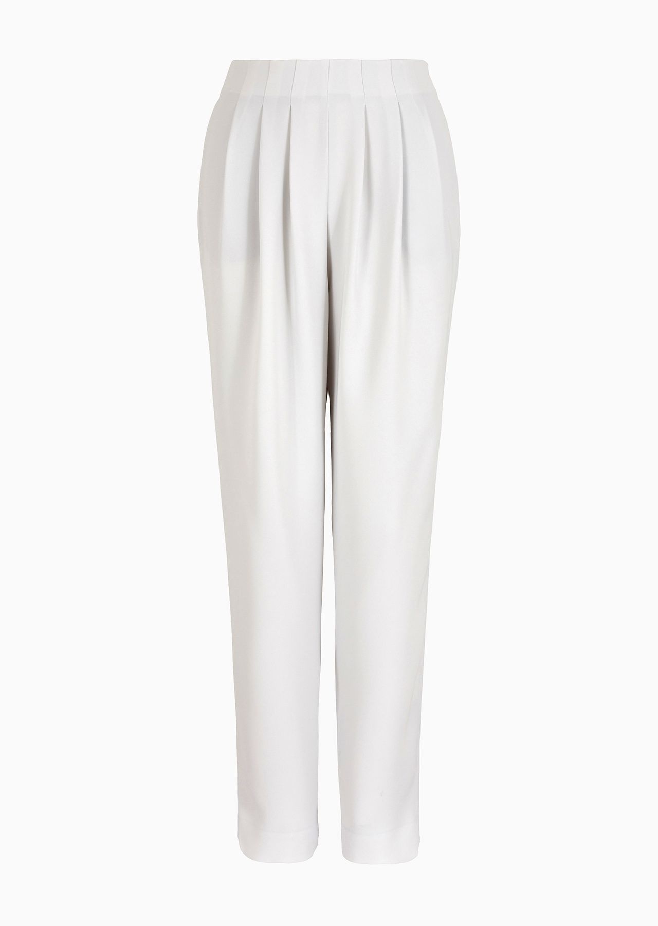 High-waisted trousers with darts that start from the top with an oval leg, made from technical cady, a flowing, lightweight fabric that gently skims over the skin, offering an impeccable look to any silhouette. With a casual yet refined appeal, these trousers are versatile enough to dress up a variety of occasions. Product Code: E3NP1B2NWAZ1637 Details Composition 100% Polyester Tech cady Wide belt Oval leg Pleats Satin interior waist Concealed zip fastening at the side Fitting The model is 178 cm tall and is wearing size 40/S (Italian Size)