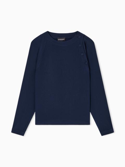 Crew-neck blouse with a special closure on the shoulder with satin buttons. Made of stretch sandblasted fabric, a smooth, sensual fabric that creates a piece designed to be worn day&night. Sandblasted fabric Crew neck Satin button closure on the left shoulder Long sleeves Product Code: EW001963AF15990UB092