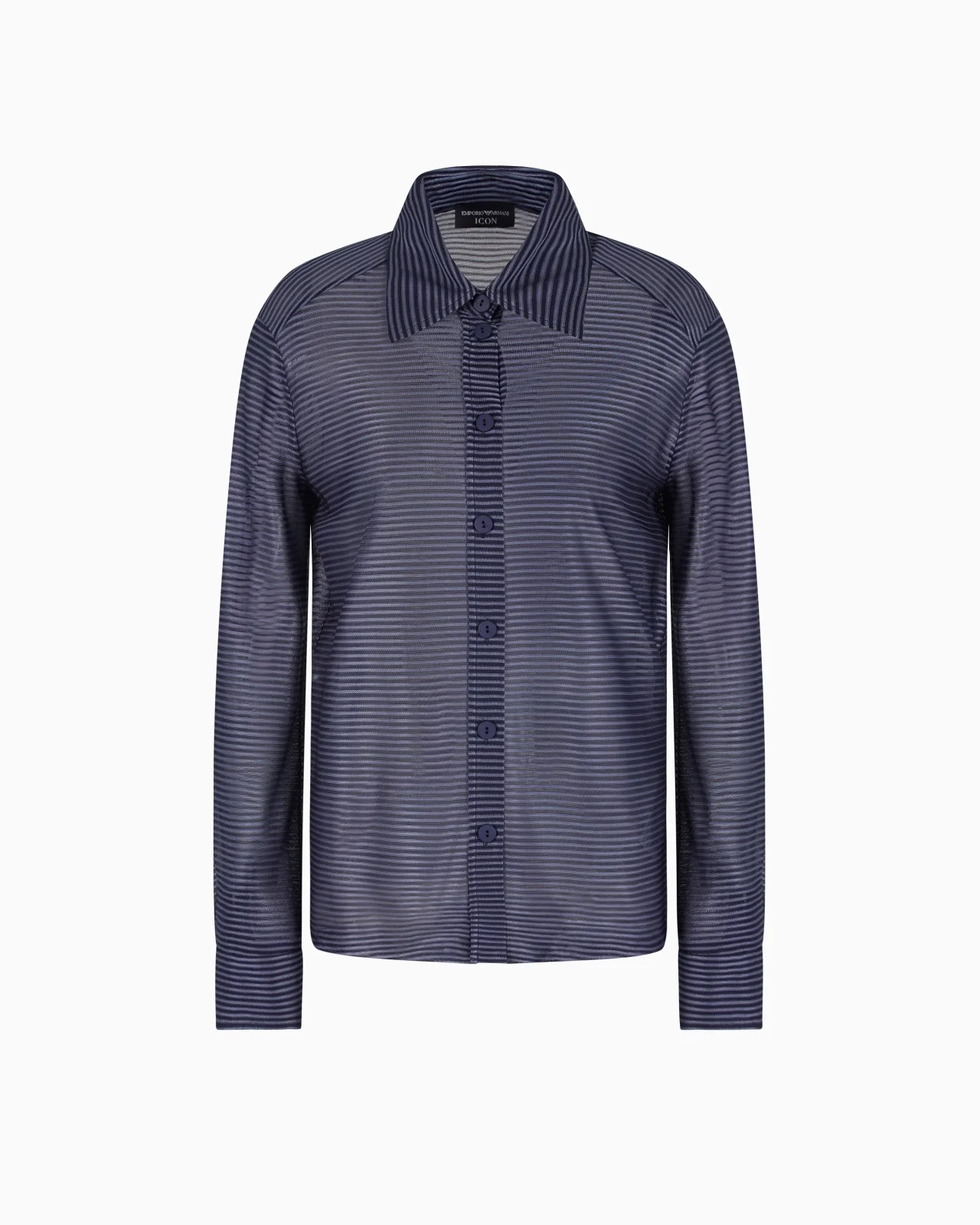 Classic-collar shirt made of lightweight viscose jersey with an all-over classic horizontal striped pattern with a ribbed effect. This piece is part of the Icon capsule collection: the essence of Emporio Armani, providing a modern interpretation of the brand’s DNA by updating the iconic shapes and volumes of its past, aimed at affirming a classic, evergreen allure. Jersey Striped design Classic collar Front buttoning Long sleeves Buttoned rounded cuffs Product Code: EW001081AF13320FB064