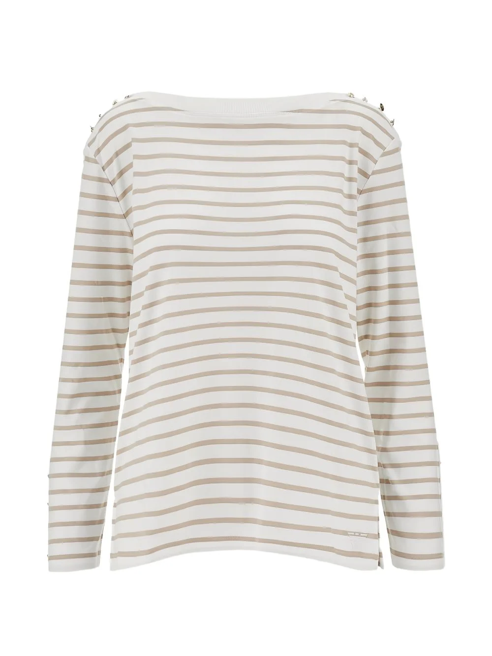 striped T-shirt Highlights - White - Stripe pattern - Shoulder embellishments - Long sleeves - Boat neck - Side slits Imported Composition Modal 50%, Cotton 50% Washing instructions Read Manufacturer Guidelines