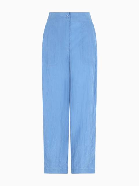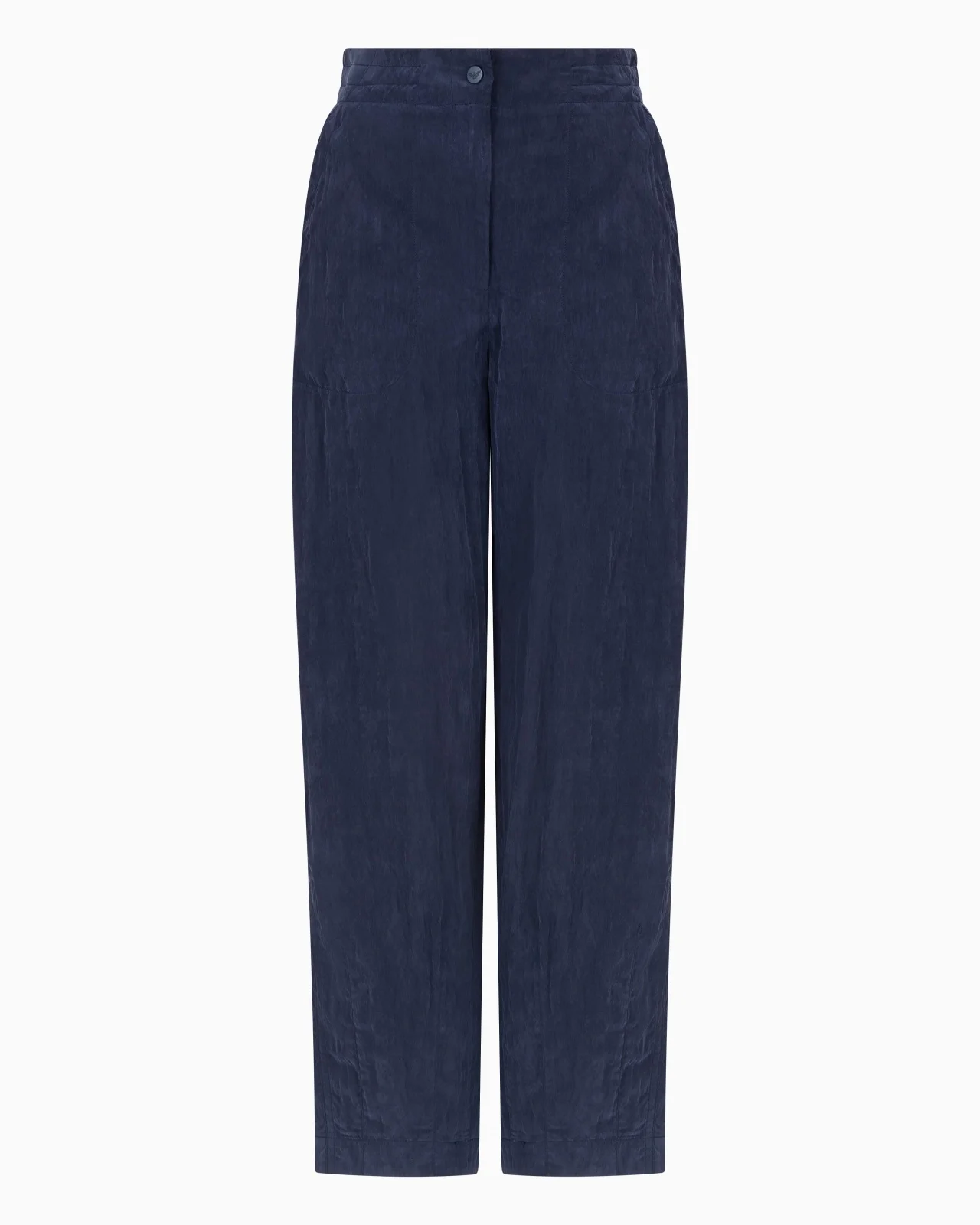 Linear-cut trousers with an elastic detail at the back of the waist in technical cupro with a fluid, cosy texture. Thanks to the fabric and comfortable, relaxed fit, it is a fresh, lightweight, feminine style that can truly be worn anywhere. Technical cupro Press stud and zip closure Waist with elastic back Side pockets Back patch pockets Embroidered micro eagle Product Code: EW000654AF12644UB097