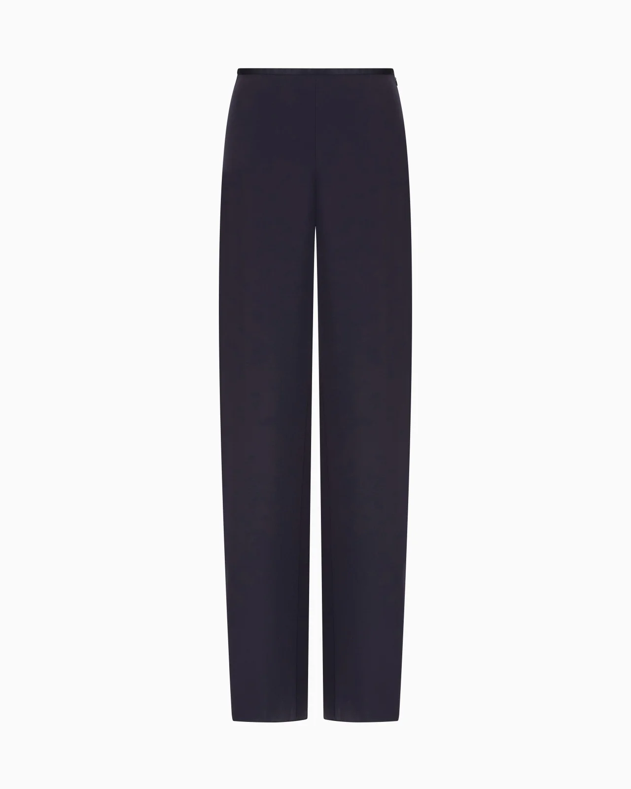Palazzo trousers with a satin-trimmed waist, made from technical cady, a flowing, lightweight fabric that gently drapes across the body, offering an impeccable look to any silhouette. These trousers are perfect from mornings in the office until drinks in the evening, providing a distinctive elegance to any occasion. Tech cady Palazzo style Satin piped waist Side closure with zip and button Side inseam pockets Product Code: EW001145AF10206UB115
