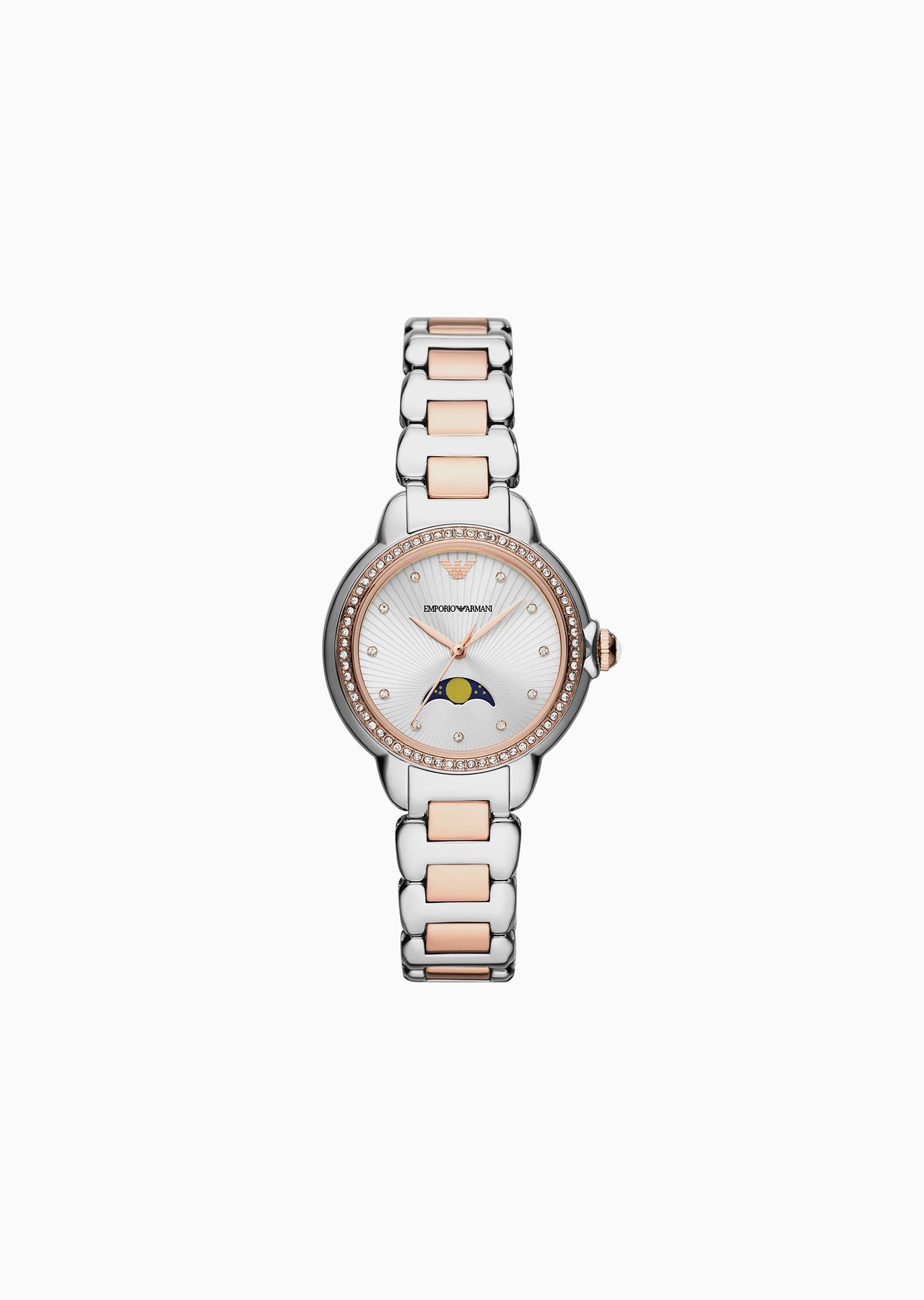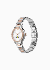 32mm watch features a silver sunray textured dial, three-hand moonphase movement and two-tone stainless steel bracelet. Product Code: AR11567_NLP1_NLC Details Composition 0% Crystal 0% Plastic 0% Stainless Steel Movement: Quartz/Multi Dial: Silver Case size: 32mm Case material: Stainless Steel Plating: Silver Strap/Bracelet: 2-ToneStainless Steel 5 ATM