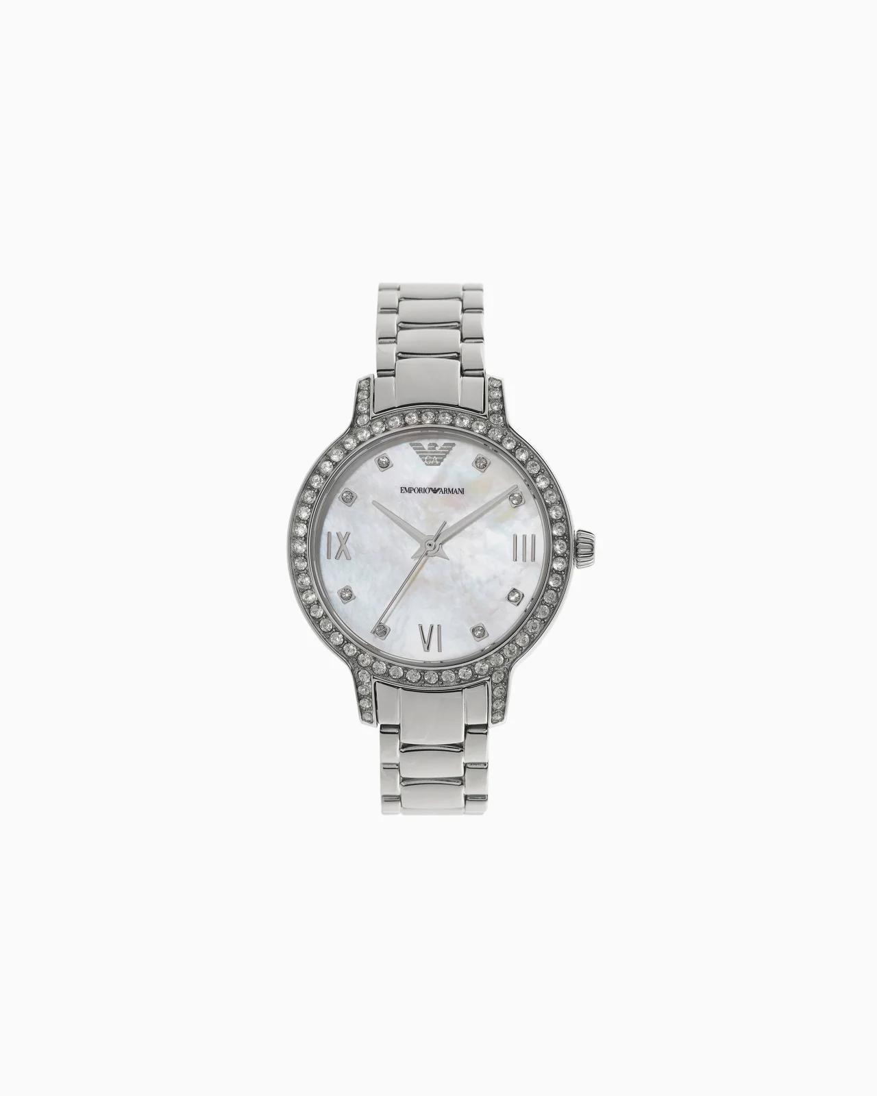 32mm watch featuring a white mother of pearl glossy dial, at least 50% recycled stainless steel case with crystals, three-hand movement and at least 50% recycled stainless steel bracelet. Movement: Quartz/3 Hand Dial: White Mother Of Pearl Case size: 32MM Case material: Stainless Steel Plating: Silver Strap/Bracelet: Stainless Steel ATM: 5 ATM Product Code: AR11484NLPNLC