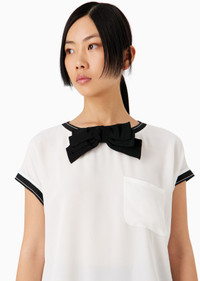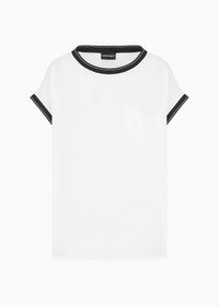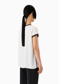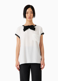 Round-neck blouse with short sleeves and front patch pocket. The item is made of viscose crepe, whose natural sheerness and lightness gives the piece a bold, ultra-feminine look that will add a touch of luxury to any outfit. Product Code: 3D2K662NP2Z10101 Details Composition 100% Viscose Viscose crepe Rounded neckline Short sleeves Rib-knit cuffs and hem Patch pocket Side slits at the hem Fitting The model is 178 cm tall and is wearing size 40/S (Italian Size)