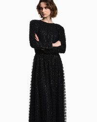 Long dress made of tulle with sequin and bead embroidery. The design features a sophisticated play of transparencies and a figure-flattering silhouette. An exquisite piece, perfect for special occasions. Tulle Sequins and beads Rounded neckline Long sleeves Peephole closure with small button at the back Serge lining Product Code: EW003338AF20540UC001