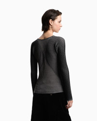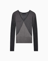 V-neck jumper with long sleeves, in a fabric with a soft feel due to a small percentage of cashmere content. The style features a dense weave of links stitches alternating with a vertical striped jacquard motif, creating a two-tone effect. Link stitch Jacquard Striped design V neck Long sleeves Made in Italy Product Code: EW002744AF20460FC102