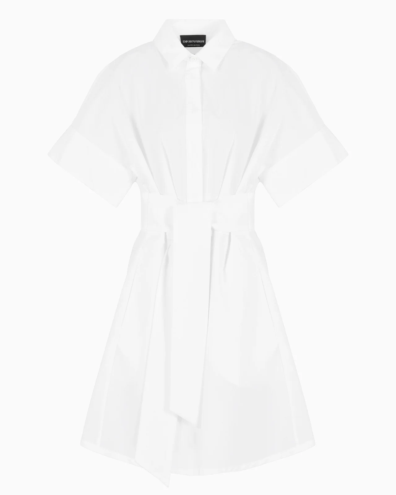 Shirt dress made of crisp pure cotton poplin, with a classic collar, short sleeves and fixed waist sash to tie at the front. The back features gathering at the waist. A tribute to the day of love and lovers: the contrasting red graphic designs embellish ready-to-wear clothing and accessories from the Valentine’s Day capsule collection, the Emporio Armani collection that celebrates love. Product Code: EW000203AF100101U0002 Details Composition 100% Cotton Poplin Classic collar Front buttoning Short sleeves Fixed waist sash Collection embroidery on the back below the neckline Fitting The model is 178 cm tall and is wearing size 40/S (Italian Size)