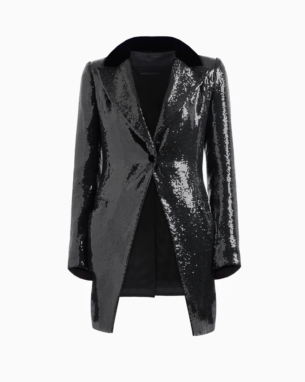 This women’s long jacket is encrusted all over with shining sequins. The style is designed to make you shine on the most special occasions in an all-black look, and is embellished with a removable necktie and a soft, deep velvet insert on the neckline. Product Code: EW000068AF102441UC001 Details Composition 100% Polyester All-over sequins Lapel neckline and velvet insert Removable velvet necktie Velvet-covered button Long sleeves Back centre vent Fitting The model is 178 cm tall and is wearing size 40/S (Italian Size)