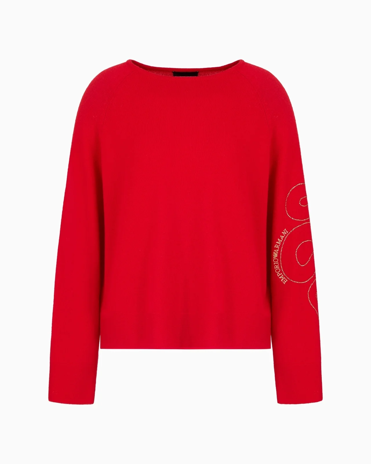 Crew-neck jumper in plain-knit virgin wool, featuring collection embroidery embellished with rhinestones on the left sleeve. The item belongs to the Lunar New Year capsule collection, whose standout feature is the snake, a symbol of wisdom, stability and intuition. Tradition and superstition merge with the roots of East Asia, creating auspicious influences and symbols, characterised by luxurious embroidery on a black and red background, brightened with luminous touches of gold. Plain knit Crew neck Long sleeves Collection embroidery with rhinestones Product Code: EW000955AF15087M5001