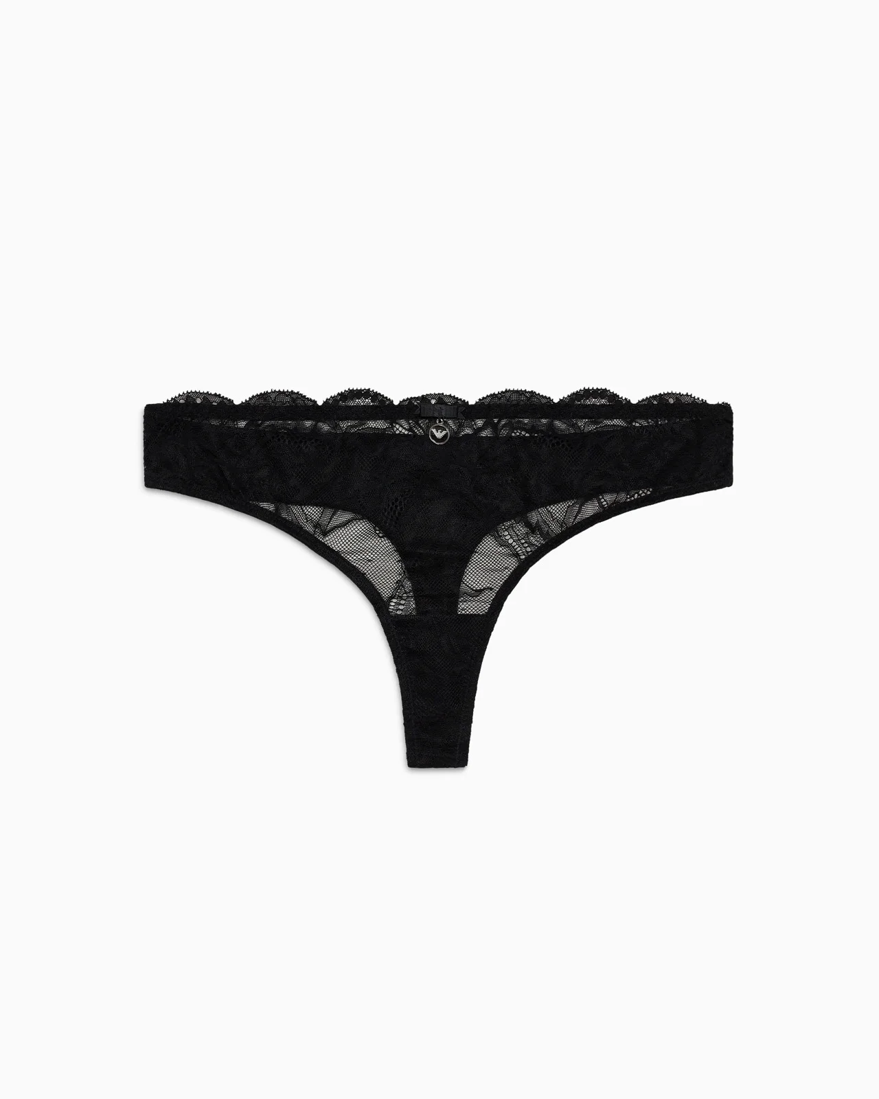 Floral lace thong. Bow and eagle logo charm at the waist. Product Code: 162468CC229100020 Details Composition 83% Polyamide 17% Elastane Tulle Lace Bow-detailed Brand logo Metal Applications