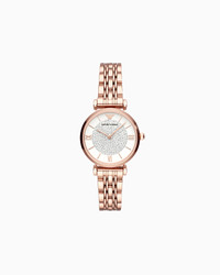 32mm watch features a matte white dial with pave stones, rose gold-tone Roman numerals and stick indexes, two-hand movement and rose gold-tone stainless steel bracelet. Movement: Quartz/2 hand Dial color: White Case size: 32mm Case material: Stainless steel Case color: Rose gold Strap/Bracelet: rose gold IP stainless steel Atm: 3 Product Code: AR11244NLPNLC