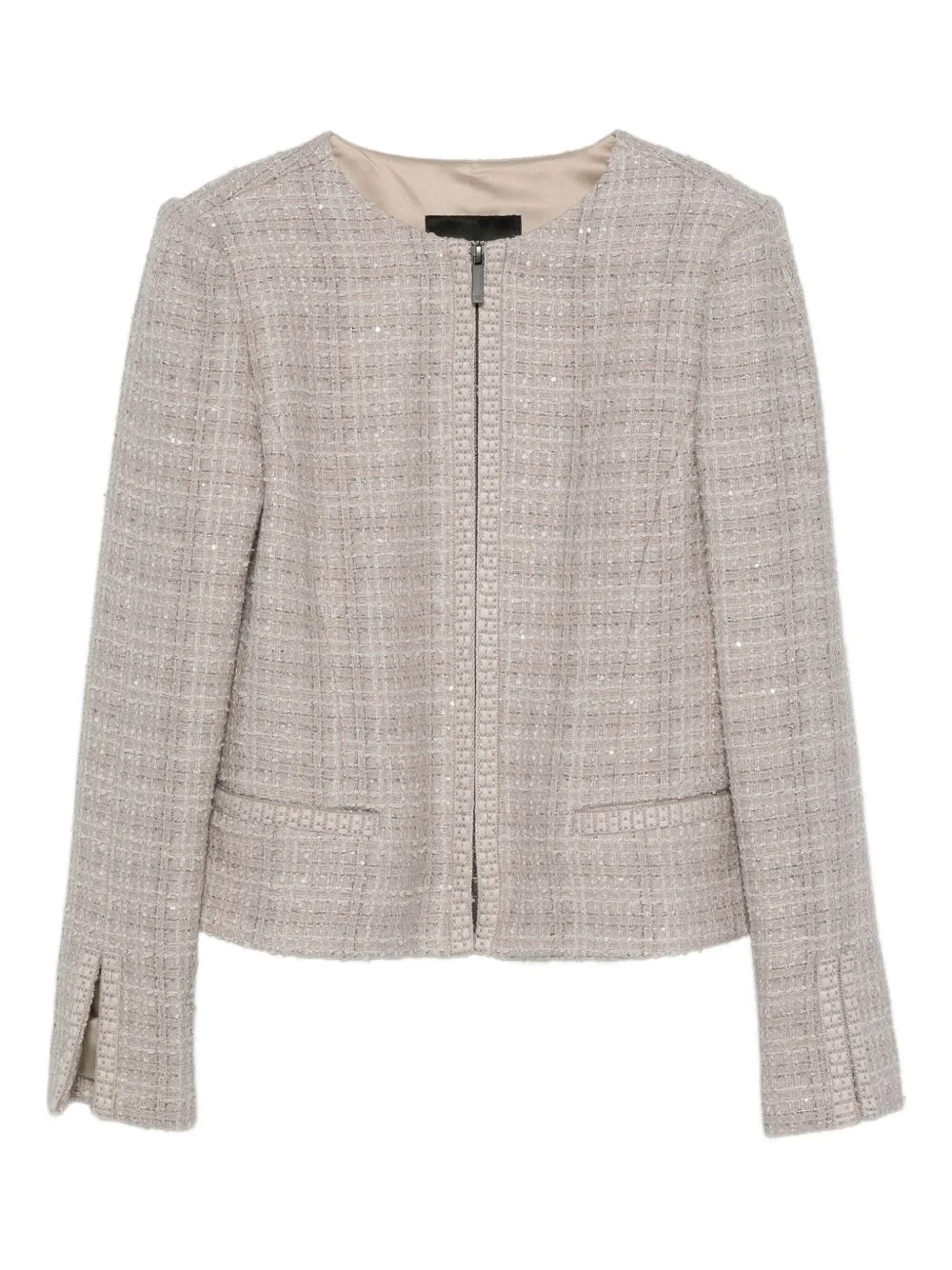 tweed sequin-embellished jacket Highlights - Grey - Tweed - Two-way zip fastening - Jetted pockets - Long sleeves Imported Composition Outer: Wool 55%, Acrylic 27%, Polyester 18% Lining: Polyester 100% SIZE & FIT Model measurements Height 5 ft 10 in(1.78 m) Bust/Chest 33.46 in(85 cm) Hips 36.22 in(92 cm) Waist 23.22 in(59 cm) Washing instructions Dry Clean Only