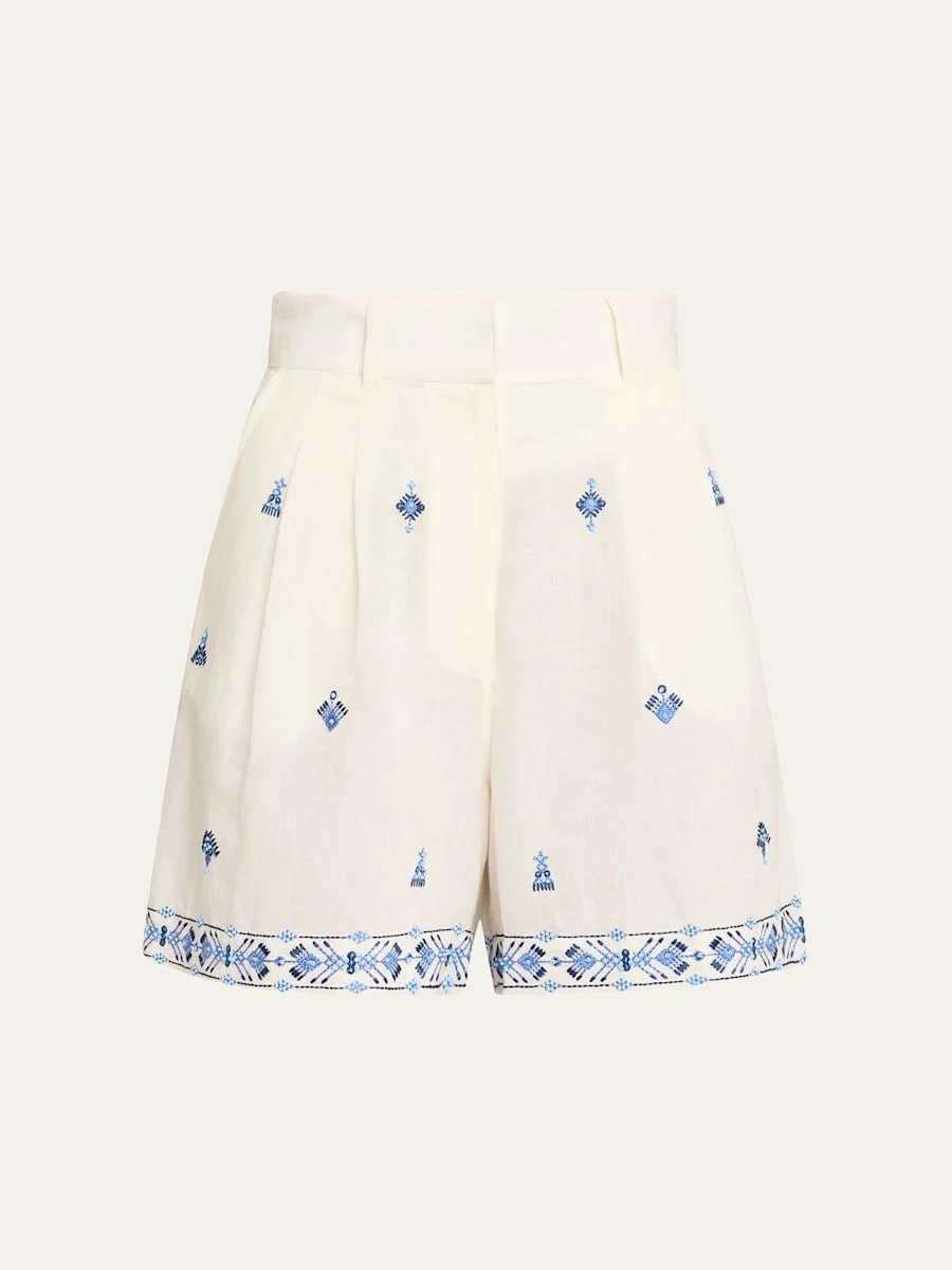 EMPORIO SIRENUSE "Beatrice" shorts featuring Astragal embroidery and a double pleated front Approx. 4.3" inseam High rise Angled side slip pockets Easy legs Hook/zip fly; belt loops Linen/cotton Unlined Trim: Beading Imported Online Inquiries: BGS21_B9ZZJ| Store Inquiries: #5018602