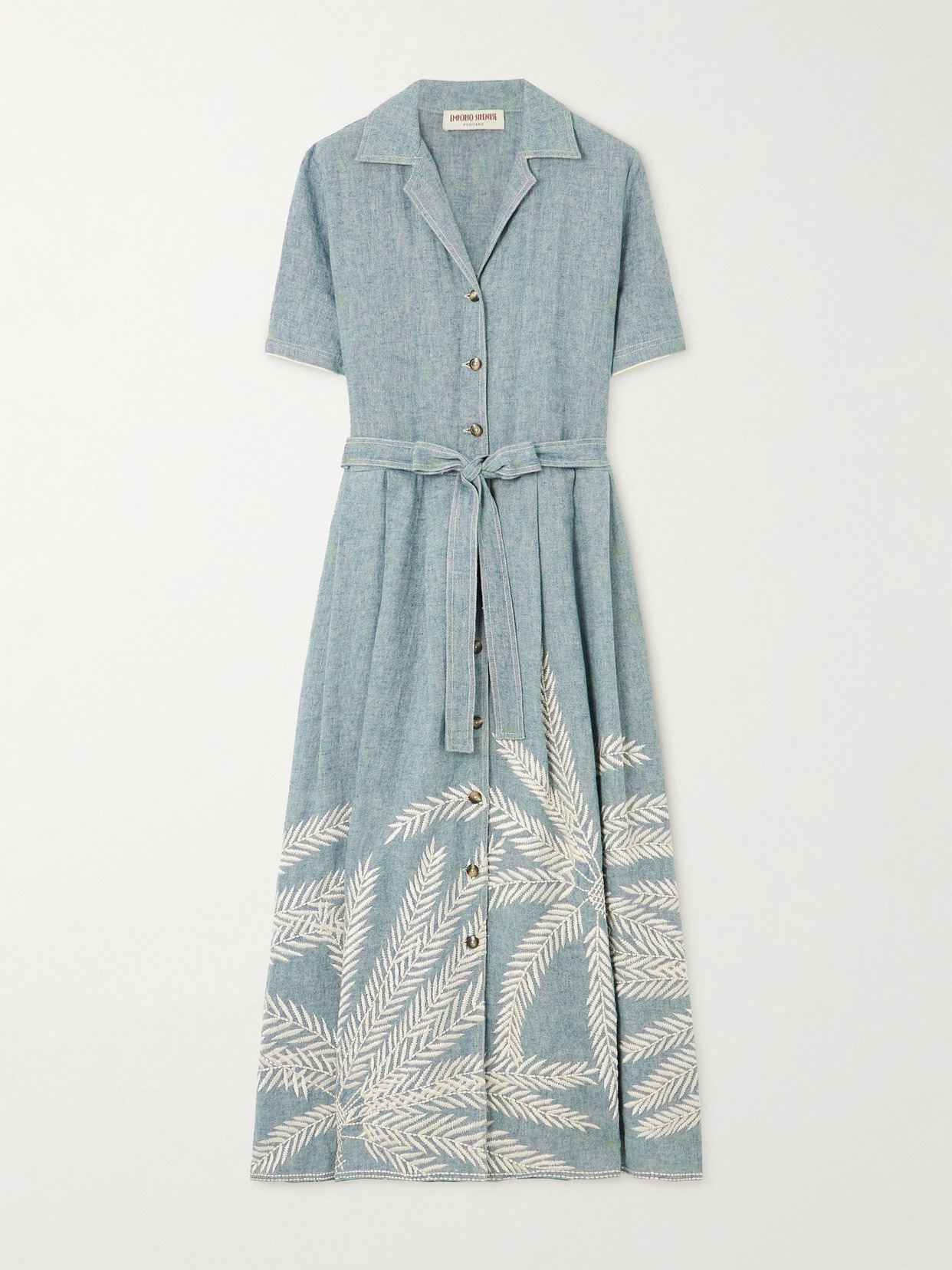 The embroidered palm leaves on Emporio Sirenuse's 'Claudia' dress are a testament to the label's attention to detail. Made from a breezy ramie and linen-blend, it has a classic shirt silhouette with a self-tie belt to cinch and define your waist. Wear yours on vacation with sandals or platform espadrilles.
