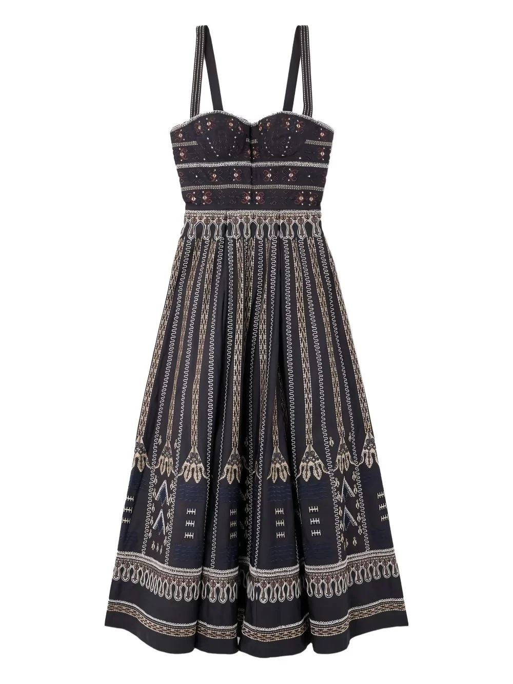 embroidered bustier midi dress Highlights - Navy blue - Intricate embroidery - Adjustable straps - Fitted bodice - Full skirt - Decorative stitching Imported Composition Cotton 75%, Polyester 25% Washing instructions Read Manufacturer Guidelines